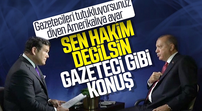 "Siz şu anda yargı mensubu gibi konuşuyorsunuz. Gazeteci gibi değil." diye sözlerine başlayan Cumhurbaşkanı, "Bir defa bu noktada gazeteci gibi konuşun ve benden de siyasetçi olarak cevabını alın. Bakın ne diyorum, devlete karşı darbe girişiminde bulunan bir DEAŞ mensubu kişi, gazeteci diye serbest kalsa ABD’de buna ne dersiniz? İyi yaptı, doğru yaptı diyebilir misiniz?" ifadelerini kullandı.