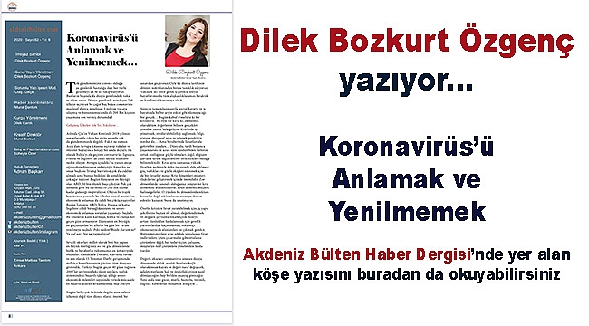 Akdeniz Bülten Haber Dergisi ve World Medya Reklam Ajansı Genel Yayın Müdürü Dilek Bozkurt Özgenç koronavirüsü bu ayki yazısına taşıdı.