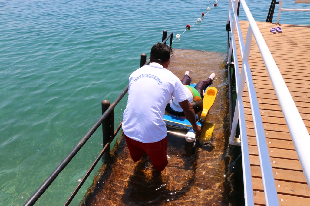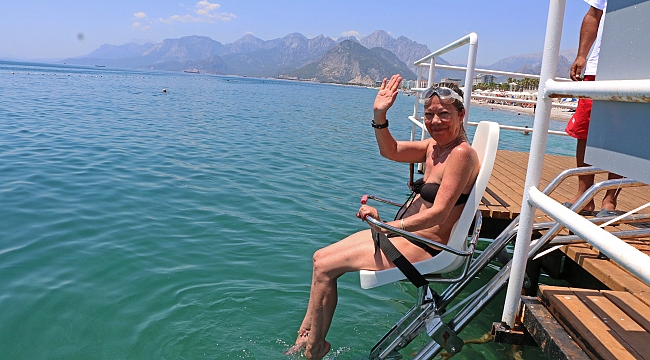 DENİZE GİREBİLMEK BÜYÜK KOLAYLIKEmekli olduktan sonra Antalya’ya yerleşen engelli birey Gülseren Kuştutan, Antalya’da yaşamanın çok farklı ve güzel olduğunu ifade ederek, “Biz engelli bireyler için çok güzel ve yararlı bir tesis. Üzerinde durduğumuz iskele, merdivenler ve asansör sistemi hepsi denize girilmesi için büyük kolaylık” diye konuştu. Bedensel engelli eşi Mustafa Özgüler’i plaja getirerek refakat eden Neriman Özgüler de Engelsiz Plajdan çok memnun olduğunu dile getirerek “Buradaki hizmetlerden memnunuz, personellerde çok ilgili davranıyor teşekkür ederiz” diye konuştu.AKDENİZ’E ENGEL YOKKonyaaltı Belediyesi’nin tam karşısında yer alan Engelsiz Plajda kendileri için tasarlanan yürüyüş platformları, özel şezlonglar, duş kabinleri ve özel soyunma kabinlerinden yararlanan engelli bireyler rahat bir şekilde denizle buluşuyor. Engelli bireyler özel platformdaki asansör sistemi ile görevli personeller aracılığıyla tek başlarına rahatlıkla denize girebiliyor.