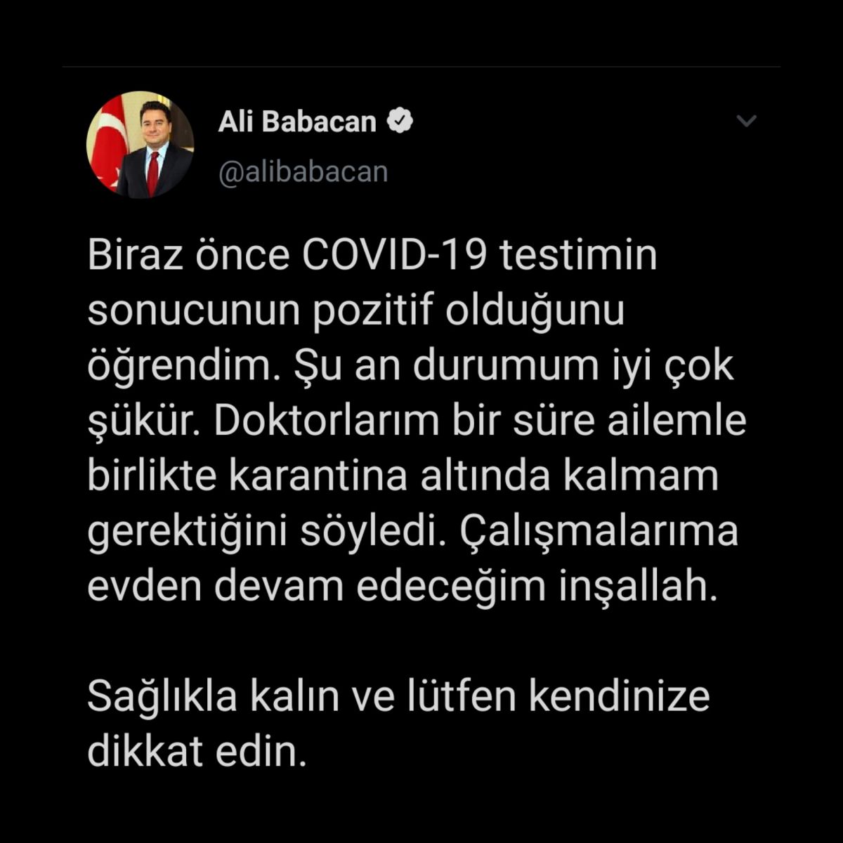 Demokrasi ve Atılım Partisi (DEVA) Genel Başkanı Ali Babacan, sosyal medya hesabından koronavirüs testinin pozitif çıktığını duyurdu. Babacan ailesi ile birlikte karantinada bulunduğunu aktardı.