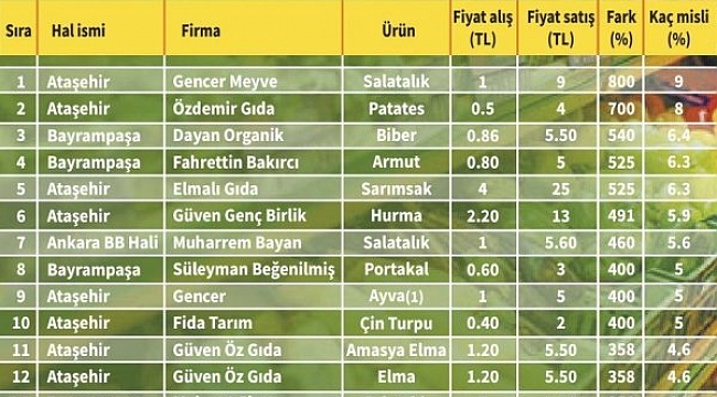Ataşehir halinde 1 liraya alınan salatalığın 9 liraya, 50 kuruşa alınan patatesin 4 liraya, 4 liraya alınan sarımsağın ise 25 liraya satıldığı ortaya çıktı.