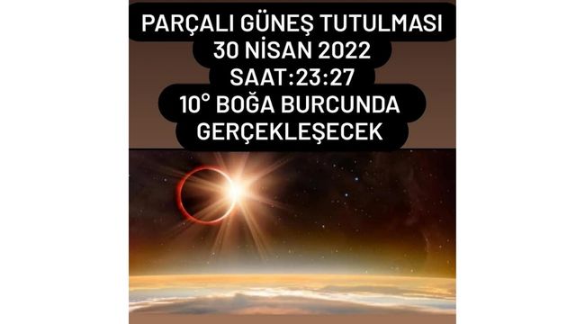 30 Nisan’da saat: 23:27’de 10° boğa burcunda Parçalı Güneş Tutulması gerçekleşecek ve 2022 yılının ilk tutulması olup, ülkemizden gözlemlenemeyecek.